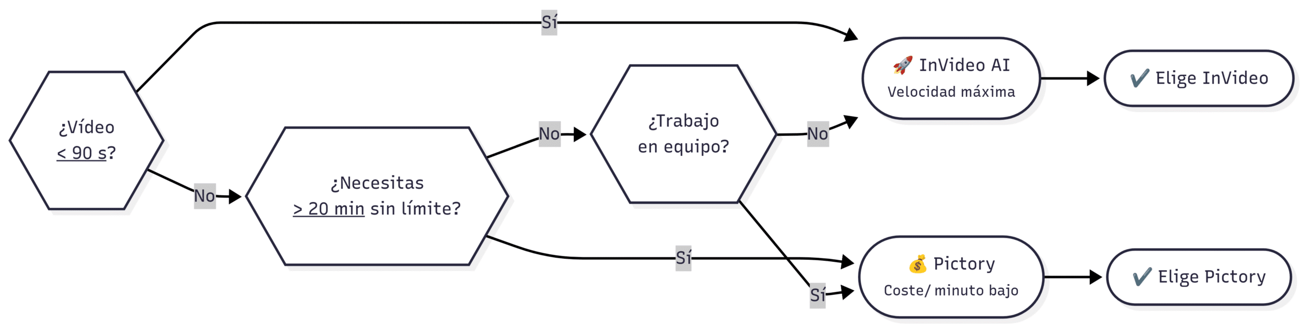 <figure style=»max-width:760px;margin:auto»> <img src=»https://dummyimage.com/760×400/0066cc/ffffff&text=Matriz:+Minutos+producidos+%C2%B7+Coste» alt=»Gráfico coste-eficiencia Pictory vs InVideo»> <figcaption style=»text-align:center;font-size:.9rem»>Cuanto más abajo y a la derecha, mejor <em>ROI</em>.</figcaption> </figure>
